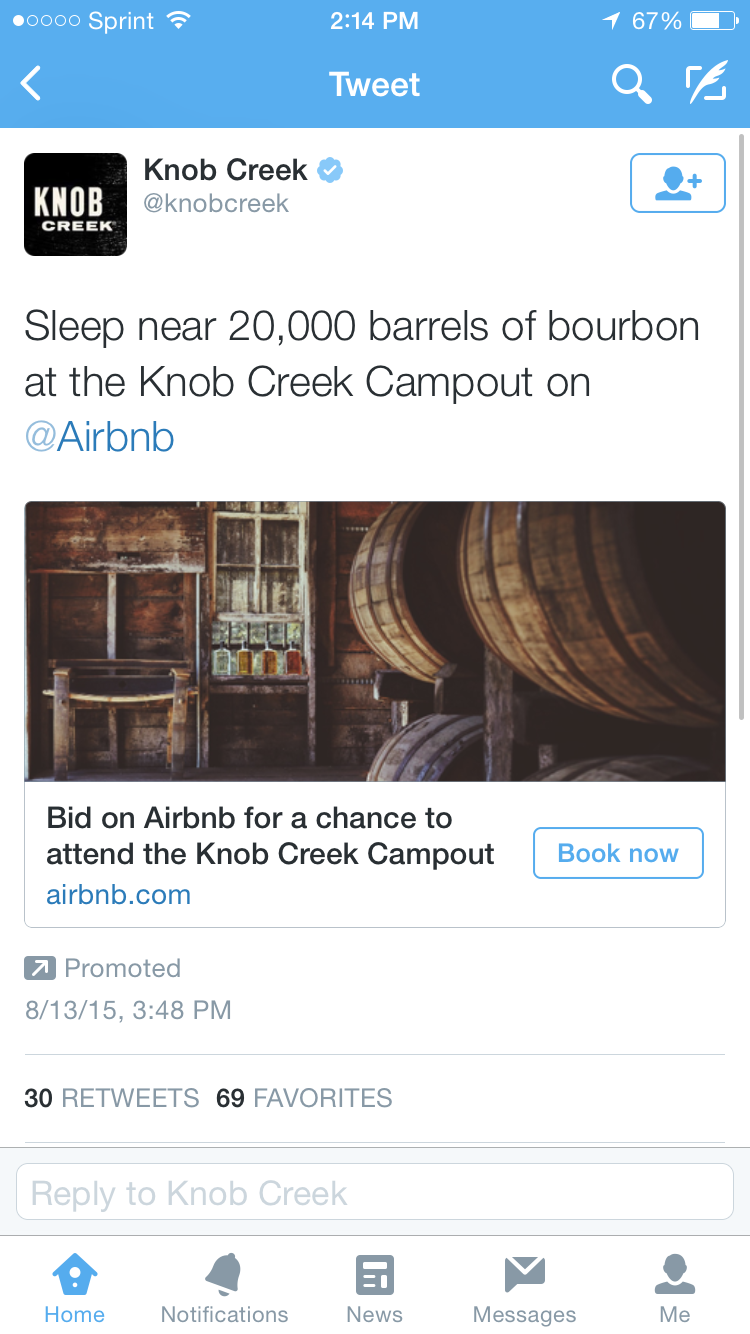 Having just traveled to the stellar A. Smith Bowman Bourbon Distillery in Fresericksburg, VA, I found it pretty serendipitous that I was shown the below ad by Knob Creek. It’s fascinating to see Airbnb used as a sort of platform for an experience, rather than merely a hotel replacement. Sure, the tent near the brewery is technically a home being rented out, but the crux of the listing is clearly the experience, not the location. It’s just a shame it was Instagram that was originally called “Burbn.”