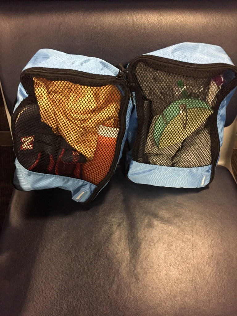 Given the cramped nature of sitting in Economy, coupled with the natural accumulation of detritus of used refresher wipes and blankets and empty pretzel bags, reaching down blindly into my bag became a surprisingly arduous task. So it was surprisingly useful to pack two Amazon Basics Packing Cubes: one for me, one for Joshie, each of which contained basically whatever each of us needed, respectively, such that all I had to do was remove the packing cube in order to retrieve whatever I needed at the time. It made my life remarkably easy.