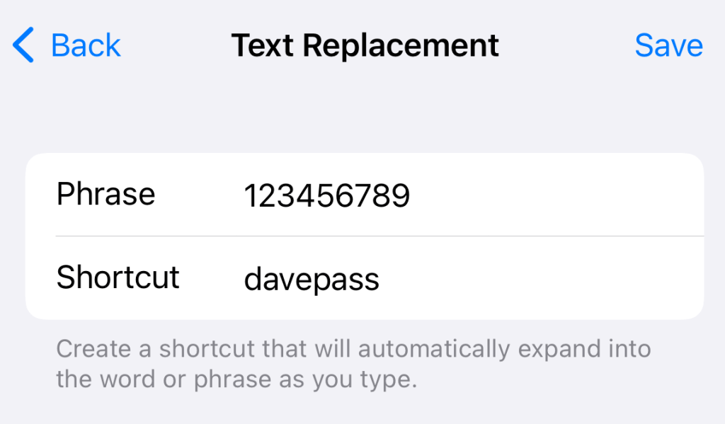 3. Choose a phrase (the thing you don’t want to remember: your passport number, SSN, drivers license, etc). Choose a shortcut (the thing that’s easy to remember: “davepass,” for example). Remember, you don’t want to choose something that you might also use in other contexts, lest you end up sending friends and coworkers your passport number in casual conversation.
