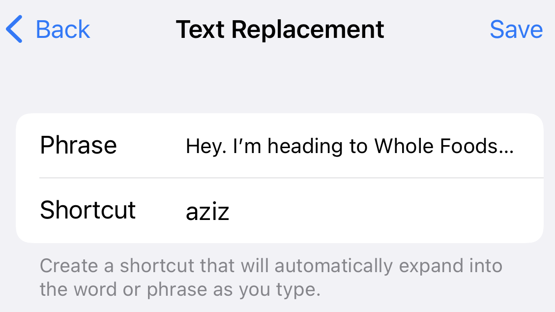 You can also use text shortcuts for longer strings of text. As you can see, I’ve also used “aziz” as a shortcut for “Hey. I’m heading to Whole Foods. Want anything?” as an homage to the 2018 Netflix show, Master of None.