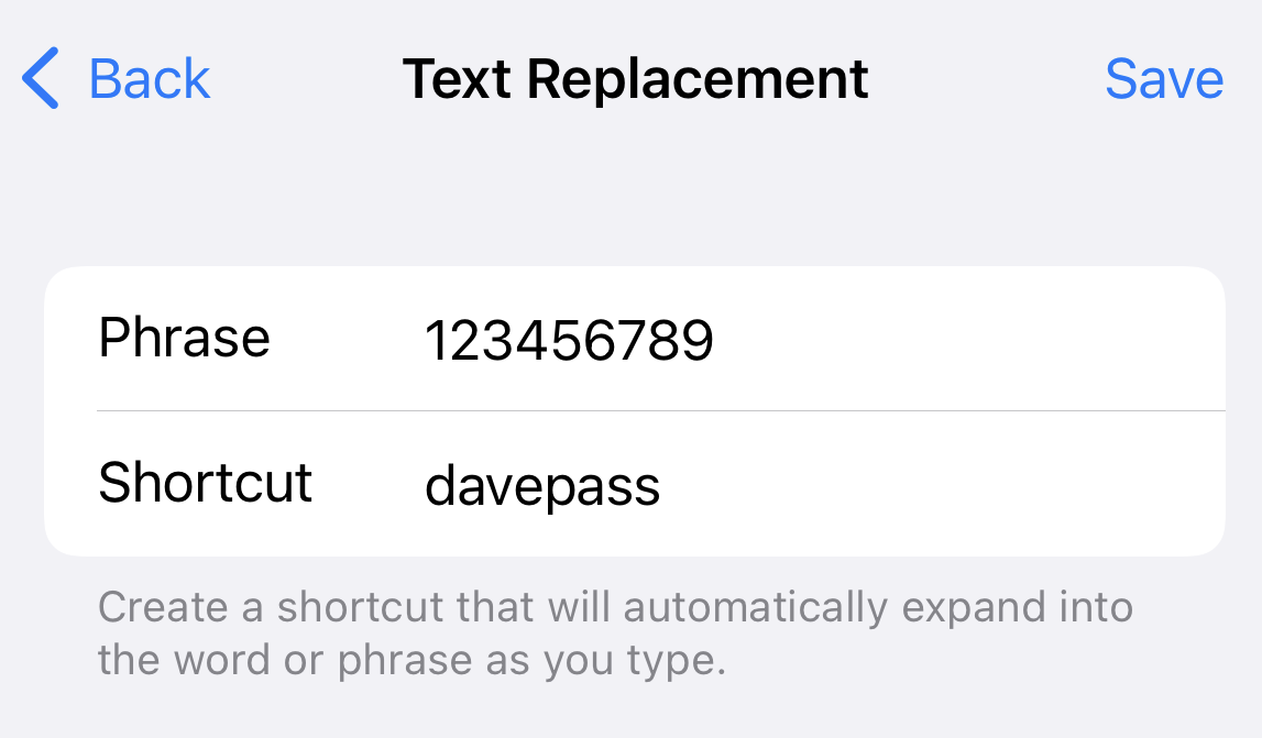 3. Choose a phrase (the thing you don’t want to remember: your passport number, SSN, drivers license, etc). Choose a shortcut (the thing that’s easy to remember: “davepass,” for example). Remember, you don’t want to choose something that you might also use in other contexts, lest you end up sending friends and coworkers your passport number in casual conversation.