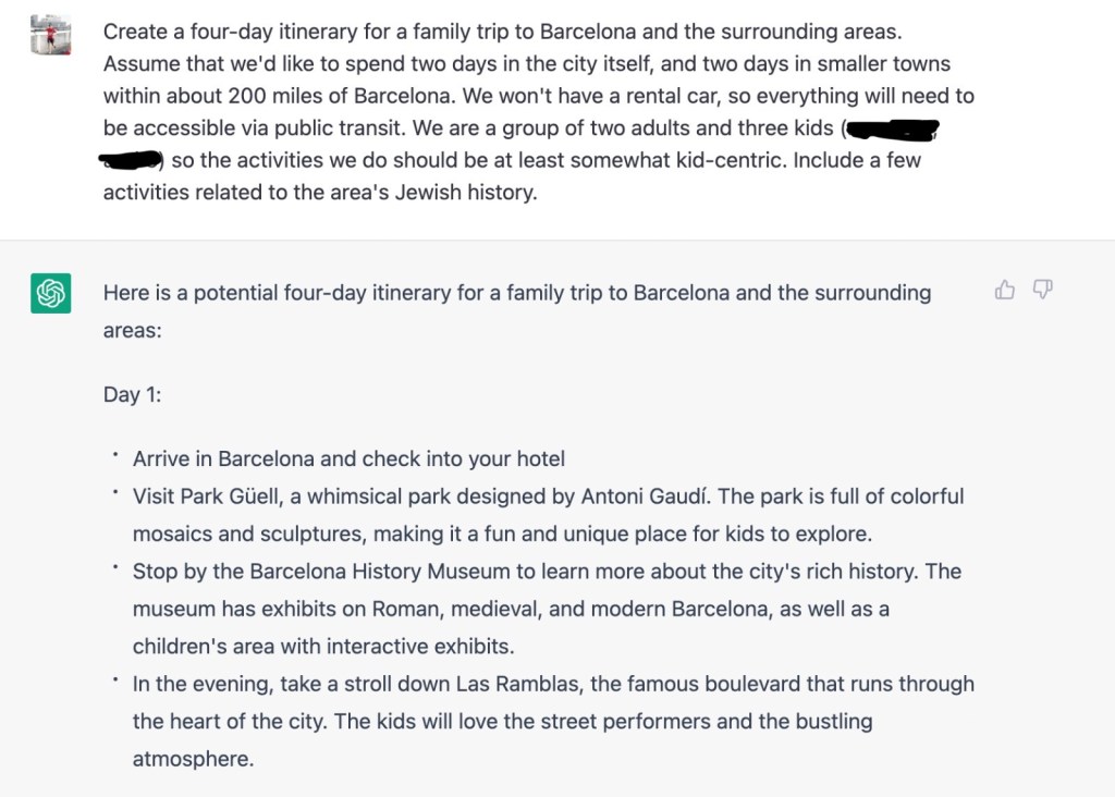 You can use it to write blog posts, create meal plans, and write term papers. I recently used it to generate plans for a potential family trip to Barcelona. The results were eerily good.