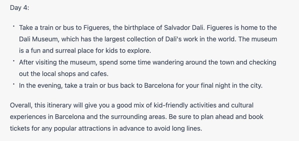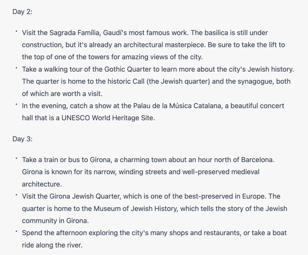 Moreover, the fact that I could then provide feedback, by asking it to refine the given parameters (for example: shorten it by a day, include a day trip into Aragon, or remove the visit to the Dalí Museum), all within seconds, is pretty astounding.