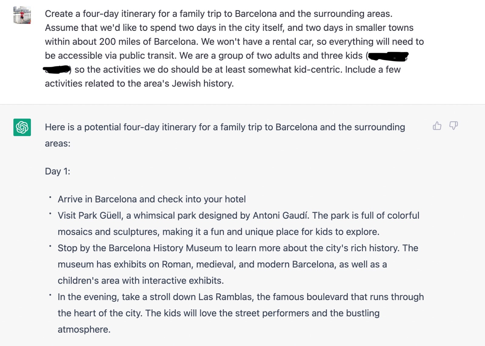Moreover, the fact that I could then provide feedback, by asking it to refine the given parameters (for example: shorten it by a day, include a day trip into Aragon, or remove the visit to the Dalí Museum), all within seconds, is pretty astounding.